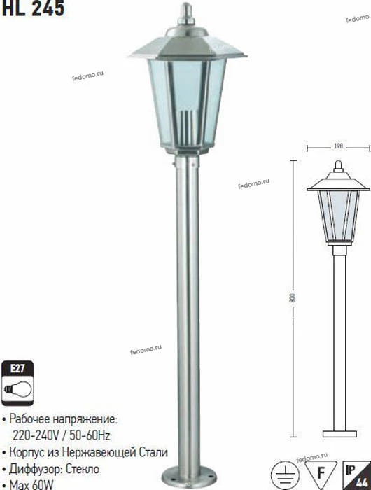 HL245 (075-006-0005) Столб уличный Horoz Akasya, 1 плафон, никель с прозрачным