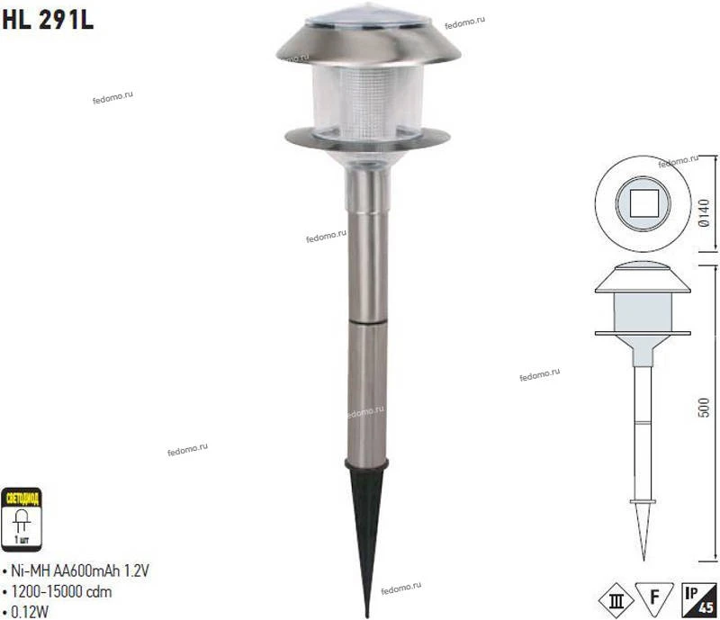 Светильник оснащен аккумулятором 1.2V AA 600mAh Ni-MH, который заряжается от солнечной энергии.
