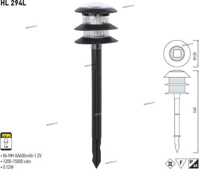Светильник оснащен аккумулятором 1.2V AA 600mAh Ni-MH, который заряжается от солнечной энергии.