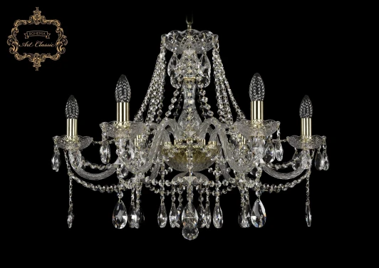 Люстра подвесная хрустальная 11.12.6.240.Gd.Sp от компании Art Classic устанавливается на металлический крюк. Классическая люстра в виде подсвечника украшена хрусталем и прекрасно подойдет в качестве источника основного света для холла, зала, оформленных в стиле барокко. Основной цвет модели - прозрачный, материал арматуры - металл, хрусталь. Модель оснащена цоколем E14 (6xE14), имеет 6 лампочек с общей мощностью 240W и напряжением 220V. Светильник поддерживает подключение диммера. Габариты: высота - 500 мм, диаметр - 700 мм, длина подвеса - 350 мм. Лампочки в комплект не входят. Лучшая цена и условия доставки на Art Classic 11.12.6.240.Gd.Sp в интернет-магазине Fedomo.ru.
