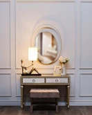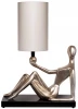 Дизайнерская настольная лампа является настоящим произведением искусства. Изящная стилизованная женская фигура серебристого цвета держит в руке бежевый плафон классической формы. Фигура женщины, приподнявшейся на локте в позе мадам Рекамье - знаменитой светской красавицы эпохи Директории во Франции XIX века, придаст особое очарование спальне, будуару или элегантному кабинету. Скульптурная композиция выполнена из дерева и полирезины; все детали окрашены и залакированы вручную по авторской технологии. Настольная лампа создаст изысканный дуэт с дизайнерской лампой арт. ART-4492-LM, изображающей стоящую фигуру с плафоном в вытянутой вверх руке.