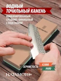 Водный точильный камень Hatamoto Japan прекрасно заточит ваши кухонные ножи для комфортной и быстрой работы. На камне две поверхности для различной степени заточки: #600 (грубая зернистость) и #2000 (средняя зернистость). Точить нож можно в два этапа, то есть, сначала наточить, затем отполировать для ещё большей остроты лезвия. Перед заточкой ножа камень необходимо замочить в воде на три-пять минут. Во время работы абразивная пыль смешивается с водой, образуя специальную пасту, необходимую для мягкой заточки, так как ножи особенно из твёрдой стали могут повредиться. Процесс заточки необходимо выполнять плавно, охватывая как можно большую часть камня.