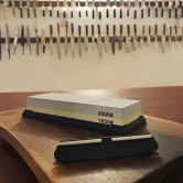 Точильный камень водный в комплекте с держателем угла заточки Hatamoto Japan (HT1011), зернистость #1000/3000, размер 180*60*27мм, комбинированный средний/финишный с подставкой. Водный точильный камень Hatamoto Japan прекрасно заточит ваши кухонные ножи для комфортной и быстрой работы. А держатель угла заточки выставит правильный угол, на камне две поверхности для различной степени заточки: #1000 (средняя зернистость) и #3000 (мелкая зернистость). Точить нож можно в два этапа, то есть, сначала наточить, затем отполировать для ещё большей остроты лезвия. Перед заточкой ножа камень необходимо замочить в воде на три-пять минут. Во время работы абразивная пыль смешивается с водой, образуя специальную пасту, необходимую для мягкой заточки, так как ножи особенно из твёрдой стали могут повредиться. Процесс заточки необходимо выполнять плавно, охватывая как можно большую часть камня.
