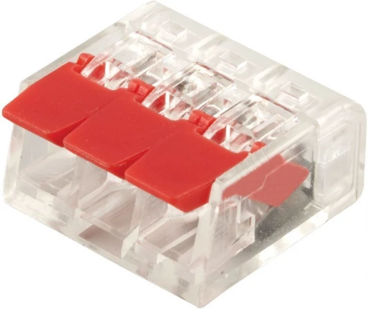Клемма пружинная универсальная компактная STEKKER LD221-413, 3-проводная 0,14/0,2 - 4мм2, 450В, 32А, без пасты, материал изделия пластик, латунь. Тип провода одножильный/многожильный, материал провода медь, температура окружающей среды -20...+40°C