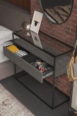 Консоль «Эйден» выполнена в современном лаконичном стиле и уместно дополнит интерьер спальной комнаты или прихожей. Стильная консоль приковывает внимание прежде всего своим исполнением: комбинацией используемых материалов. Стеклянная столешница из тонированного закаленного стекла в сером цвете дополнена полкой и ящиками для удобного хранения подручных вещей с системой открывания PUSH-TO-OPEN. А прочный металлический профиль толщиной 15 мм обеспечивает высокую прочность и устойчивость. Цветовое решение консоли можно выбрать из вариантов предложенных нашей фабрикой. Дизайнерский прием - возможность комбинировать с другими предметами интерьера из серии "Эйден", позволяя воссоздать атмосферу истинного комфорта и удобства. Продукция поставляется в разобранном виде, упакованная в гофрокартон. В комплект входит вся необходимая фурнитура и удобная инструкция для сборки. Максимальная нагрузка до 15 кг, на один ящик до 5 кг.