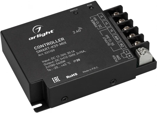 Контроллер для светодиодной MIX ленты (ШИМ). Питание/рабочее напряжение 12-36VDC, максимальный ток 15A на канал, 2 канала, максимальная мощность 360-1080W. Винтовые клеммы. Корпус - металл. Габариты 107x75x24.5 мм. Управляется пультами и панелями серии SMART (поставляются отдельно).