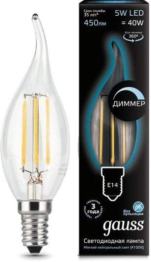 Лампочка светодиодная 104801205-D из серии Gauss Filament от компании Gauss имеет нейтральное белое свечение и цветовую температуру 4100K. Световой индекс изделия 450 lm, цоколь E14, мощность 5 Вт, напряжение 220V. Лампочка прослужит не менее 35000 часов. Лучшая цена и условия доставки на Gauss 104801205-D в интернет-магазине Fedomo.ru.