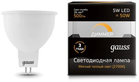 Лампочка светодиодная 101505105-D от компании Gauss имеет теплое желтое свечение и цветовую температуру 3000K. Световой индекс изделия 500 lm, цоколь GU5.3, мощность 5 Вт, напряжение 220V. Лампочка прослужит не менее 35000 часов. Лучшая цена и условия доставки на Gauss 101505105-D в интернет-магазине Fedomo.ru.