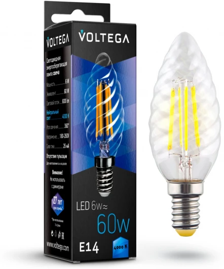Лампочка светодиодная 7028 из серии Voltega Crystal от компании Voltega имеет прозрачную колбу формы свеча, нейтральное белое свечение и цветовую температуру 4000K. Световой индекс изделия 600 lm, цоколь E14, мощность 6 Вт, напряжение 220V. Лучшая цена и условия доставки на Voltega 7028 в интернет-магазине Fedomo.ru.