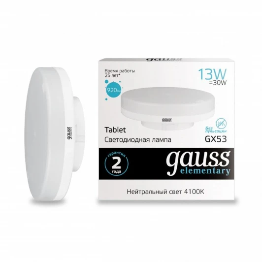 Лампочка светодиодная 83823 из серии Gauss Elementary от компании Gauss имеет белую колбу формы таблетка, дневное белое свечение и цветовую температуру 4100K. Световой индекс изделия 920 lm, цоколь GX53, мощность 13 Вт, напряжение 220V. Лучшая цена и условия доставки на Gauss 83823 в интернет-магазине Fedomo.ru.