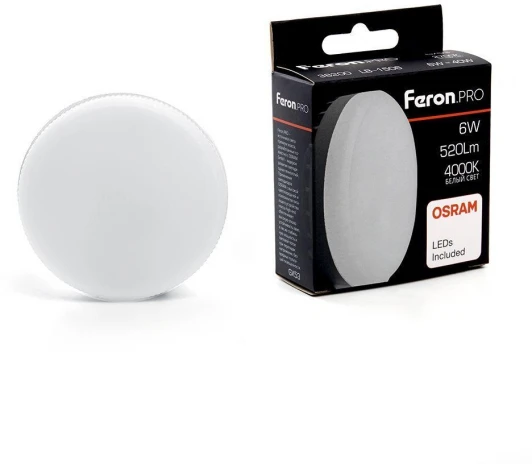 Лампочка светодиодная таблетка LB-1506 38200 от российской фабрики Feron. Лампочка с цоколем 1xGX53 обладает мощностью 6W, цветовой температурой 4000К. Световой поток 520 Lm. Питание от сети 220V. Габариты: высота — 26 мм, диаметр — 73 мм. Заказывайте Feron 38200 онлайн по низкой цене с гибкими условиями доставки на Fedomo.ru!