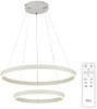 Светодиодная люстра Citilux Дуэт CL719640 в современном стиле, цвет белый. Люстра на тросах в форме каскада из двух подвесных колец, высоту и угол наклона каждого из которых можно легко изменить. Кольца изготовлены из алюминиевого профиля с рассеивателем из оптического полимера. Наличие источников света с двух сторон профиля позволяет равномерно осветить всё помещение. Модель управляется пультом дистанционного управления. Пульт ДУ в комплекте, тип батареек ААА (батарейками не комплектуется). Доступно: плавная регулировка яркости от 10 до 100%; управление цветовой температурой от 3000К до 5500К, можно настроить любые оттенки теплого, нейтрального и холодного света. Есть четыре настраиваемых режима памяти, от М1 до М4, которыми также можно управлять настенным выключателем.
