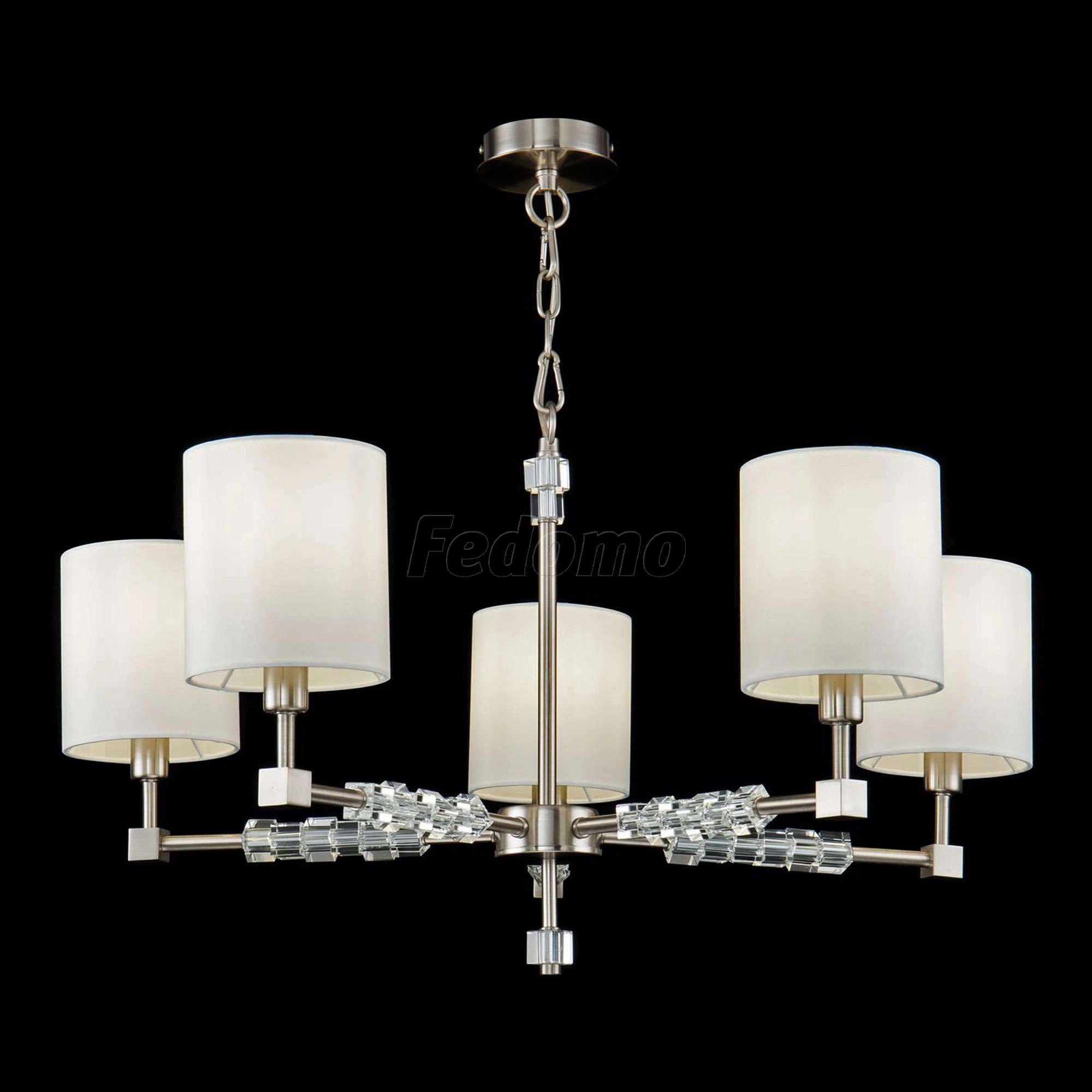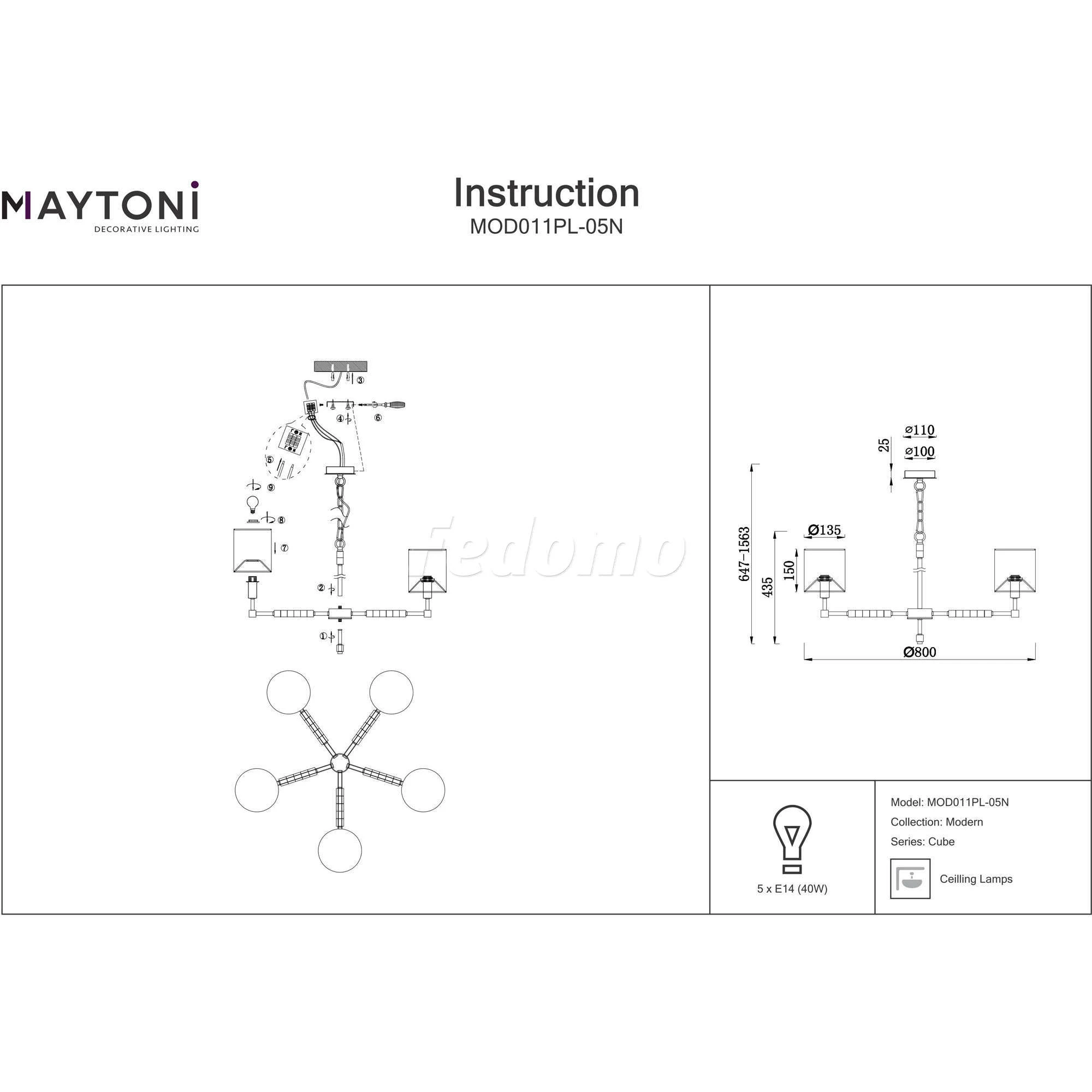 Люстра подвесная MOD011PL-05N из серии Cube от компании Maytoni регулируется по высоте и устанавливается на монтажную пластину. Люстра прекрасно подойдет в качестве источника основного света для гостиной, кафе, кухни, кабинета, оформленных в стиле модерн. Основной цвет модели - белый, материал арматуры - металл. Люстра имеет 5 абажуров со свечением вверх, материал изготовления - матовая ткань. Модель оснащена цоколем E14 (5xE14), имеет 5 лампочек с общей мощностью 200W и напряжением 220V. Светильник поддерживает подключение диммера. Габариты: высота - 1535 мм, диаметр - 800 мм. Лампочки в комплект не входят. Лучшая цена и условия доставки на Maytoni MOD011PL-05N в интернет-магазине Fedomo.ru.