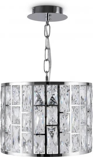 Металлическая арматура, цвет – хром. Каркас абажура – металл, декор – прозрач ный хрусталь. Потолочные модели с рассеивателем из матового стекла. Высота подвесных светильников регулируется.