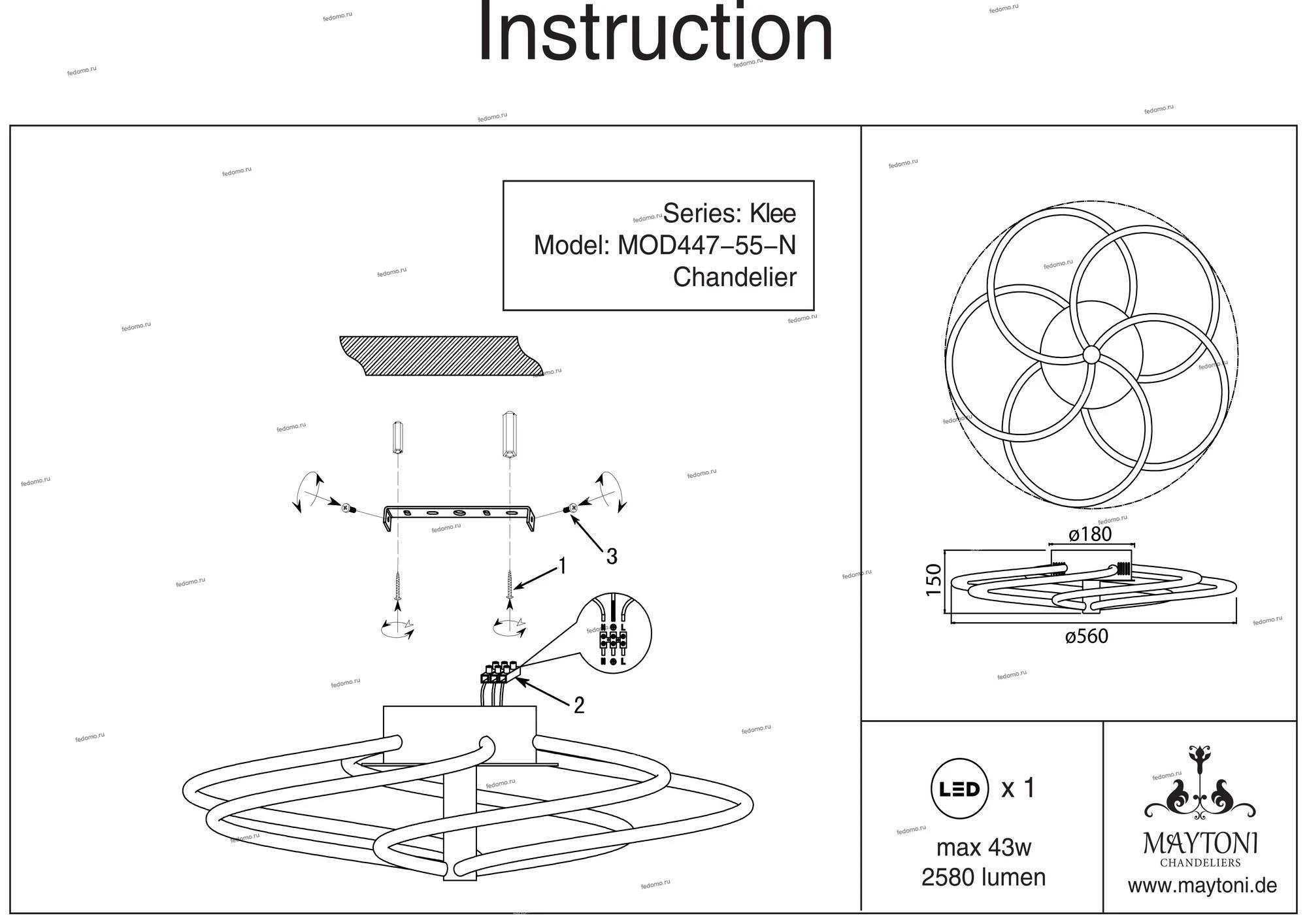 Люстра потолочная MOD447-55-N из серии Klee от компании Maytoni устанавливается на монтажную пластину. Современная люстра прекрасно подойдет в качестве источника основного света для гостиной, спальни, кухни, кабинета, оформленных в стиле хай-тек, минимализм. Основной материал арматуры - металл. Люстра имеет 5 рассеивателей, материал изготовления - акрил. Светодиодная модель оснащена цоколем LED с общей мощностью 43W и напряжением 220V. Светильник имеет цветовую температуру 3000К. Габариты: высота - 150 мм, диаметр - 560 мм. В комплекте есть лампочки. Лучшая цена и условия доставки на Maytoni MOD447-55-N в интернет-магазине Fedomo.ru.