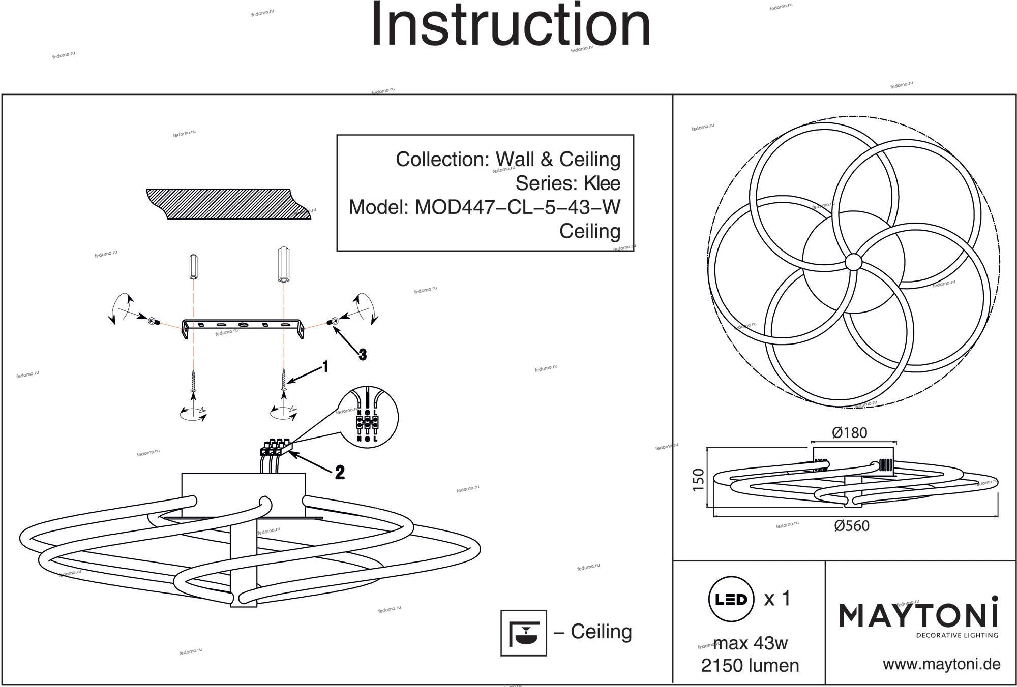 Люстра потолочная MOD447-CL-5-43-W из серии Klee от компании Maytoni устанавливается на монтажную пластину. Современная люстра прекрасно подойдет в качестве источника основного света для прихожей и коридора, кафе, спальни, кабинета, офиса, оформленных в стиле хай-тек, минимализм. Основной цвет модели - белый, материал арматуры - металл. Люстра имеет 5 рассеивателей со свечением вниз, материал изготовления - матовый металл. Светодиодная модель с цоколем LED (2150xLED), имеет 1 лампочку с мощностью 43W и напряжением 220V. Габариты: высота - 100 мм, диаметр - 560 мм. В комплекте есть лампочки. Лучшая цена и условия доставки на Maytoni MOD447-CL-5-43-W в интернет-магазине Fedomo.ru.