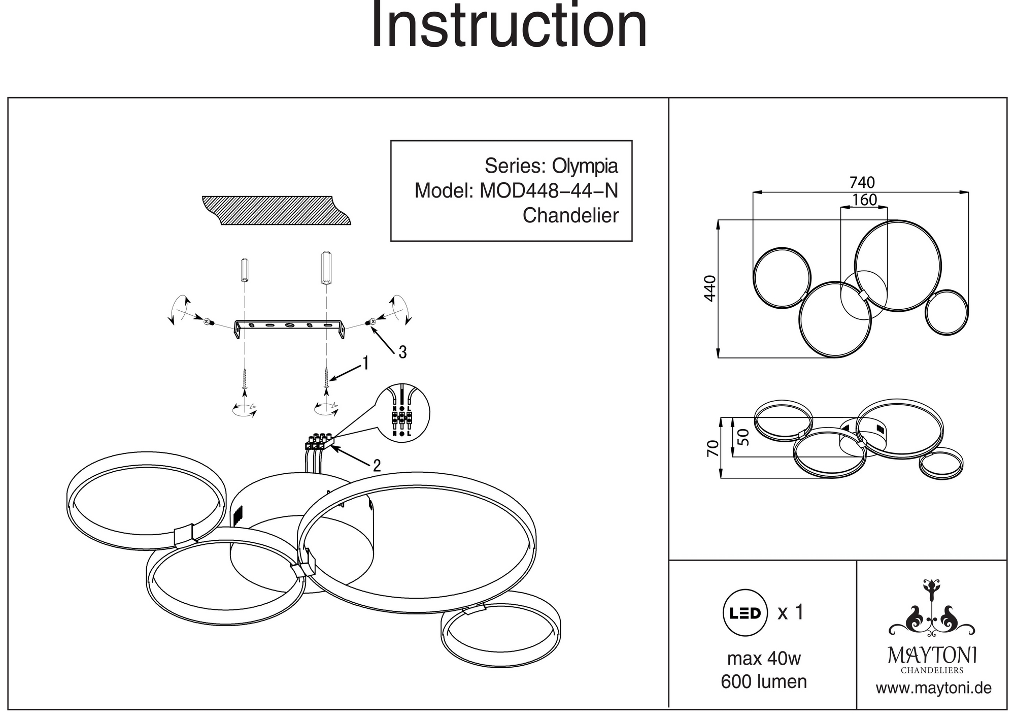 Люстра потолочная MOD448-44-N из серии Olympia от компании Maytoni устанавливается на монтажную пластину. Современная люстра прекрасно подойдет в качестве источника основного света для гостиной, спальни, кухни, кабинета, оформленных в стиле хай-тек, минимализм. Основной цвет модели - хром, материал арматуры - металл. Люстра имеет 4 рассеивателя, материал изготовления - акрил. Светодиодная модель оснащена цоколем LED с общей мощностью 30W и напряжением 220V. Светильник имеет цветовую температуру 3000К. Габариты: ширина - 740 мм, высота - 20 мм. В комплекте есть лампочки. Лучшая цена и условия доставки на Maytoni MOD448-44-N в интернет-магазине Fedomo.ru.
