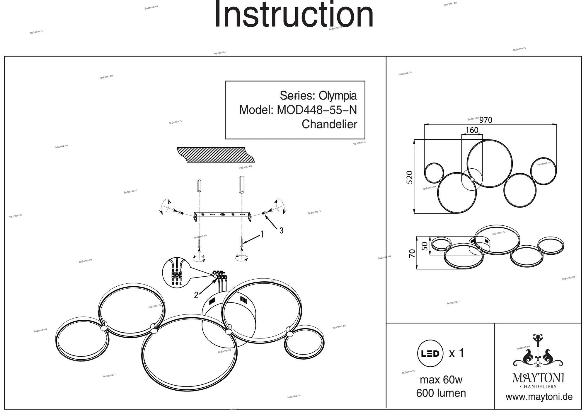Люстра потолочная MOD448-55-N из серии Olympia от компании Maytoni устанавливается на монтажную пластину. Современная люстра прекрасно подойдет в качестве источника основного света для гостиной, спальни, кухни, кабинета, оформленных в стиле хай-тек, минимализм. Основной цвет модели - хром, материал арматуры - металл. Люстра имеет 5 рассеивателей, материал изготовления - акрил. Светодиодная модель оснащена цоколем LED с общей мощностью 45W и напряжением 220V. Светильник имеет цветовую температуру 3000К. Габариты: ширина - 970 мм, высота - 20 мм. В комплекте есть лампочки. Лучшая цена и условия доставки на Maytoni MOD448-55-N в интернет-магазине Fedomo.ru.