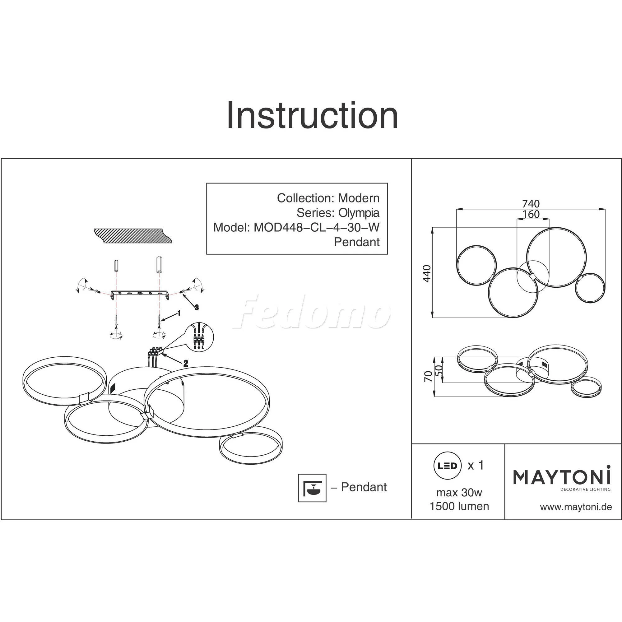 Люстра потолочная MOD448-CL-4-30-W из серии Olympia от компании Maytoni устанавливается на монтажную пластину. Современная люстра прекрасно подойдет в качестве источника основного света для прихожей и коридора, кафе, спальни, кабинета, офиса, оформленных в стиле хай-тек, минимализм. Основной цвет модели - белый, материал арматуры - металл. Люстра имеет 4 рассеивателя со свечением вниз, материал изготовления - матовый металл. Светодиодная модель с цоколем LED (1500xLED), имеет 1 лампочку с мощностью 30W и напряжением 220V. Габариты: ширина - 740 мм, высота - 20 мм. В комплекте есть лампочки. Лучшая цена и условия доставки на Maytoni MOD448-CL-4-30-W в интернет-магазине Fedomo.ru.