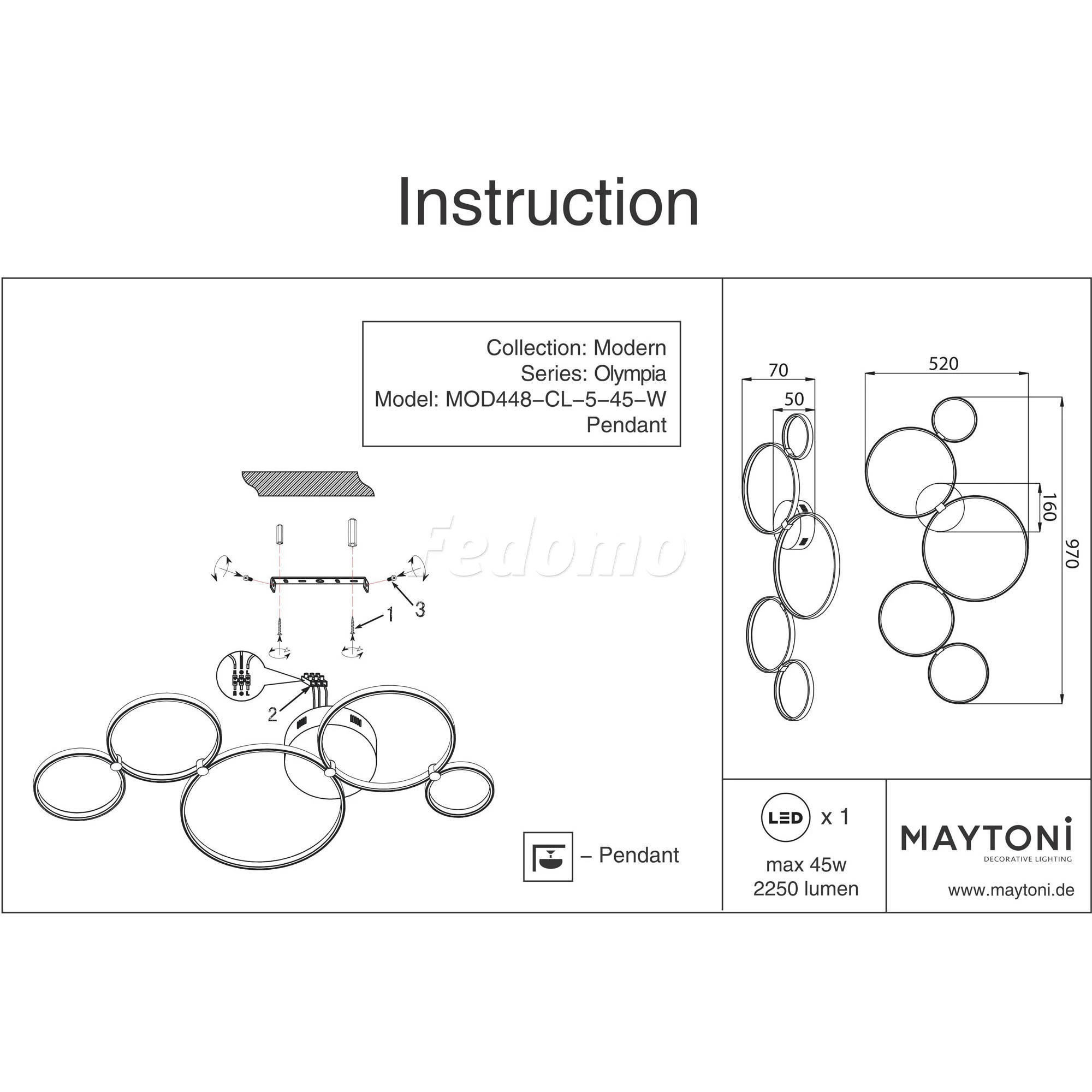 Люстра потолочная MOD448-CL-5-45-W из серии Olympia от компании Maytoni устанавливается на монтажную пластину. Современная люстра прекрасно подойдет в качестве источника основного света для прихожей и коридора, кафе, спальни, кабинета, офиса, оформленных в стиле хай-тек, минимализм. Основной цвет модели - белый, материал арматуры - металл. Люстра имеет 5 рассеивателей со свечением вниз, материал изготовления - матовый металл. Светодиодная модель с цоколем LED (2250xLED), имеет 1 лампочку с мощностью 45W и напряжением 220V. Габариты: ширина - 970 мм, высота - 20 мм. В комплекте есть лампочки. Лучшая цена и условия доставки на Maytoni MOD448-CL-5-45-W в интернет-магазине Fedomo.ru.