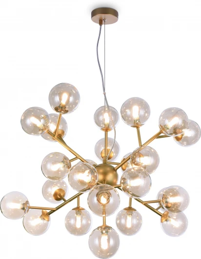 Металлическая арматура в четырех цветах: матовый черный, хром, золото, латунь. Плафоны — выдувное стекло. Цвета — дымчатый, янтарный, коньячный. Дизайн с имитацией молекулярной структуры. Высота подвесных светильников регулируется тросом. Лампа с цоколем G9.