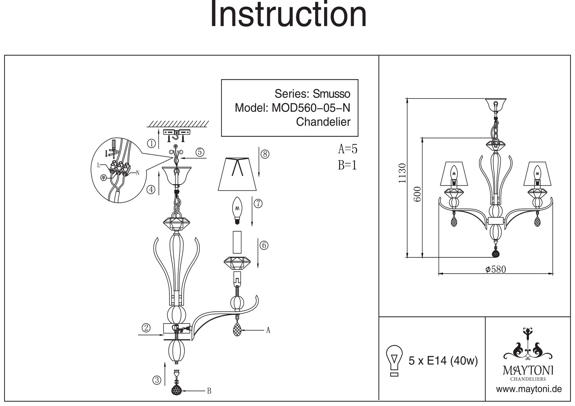 Люстра подвесная MOD560-05-N из серии Smusso от компании Maytoni устанавливается на металлический крюк. Классическая люстра прекрасно подойдет в качестве источника основного света для гостиной, спальни, кабинета, оформленных в стиле арт-деко. Основной цвет модели - белый, материал арматуры - металл. Люстра имеет 5 абажуров, материал изготовления - ткань. Модель оснащена цоколем E14 (5xE14), имеет 5 лампочек с общей мощностью 200W и напряжением 220V. Светильник поддерживает подключение диммера. Габариты: высота - 1110 мм, диаметр - 580 мм, длина подвеса - 400 мм. Лампочки в комплект не входят. Лучшая цена и условия доставки на Maytoni MOD560-05-N в интернет-магазине Fedomo.ru.
