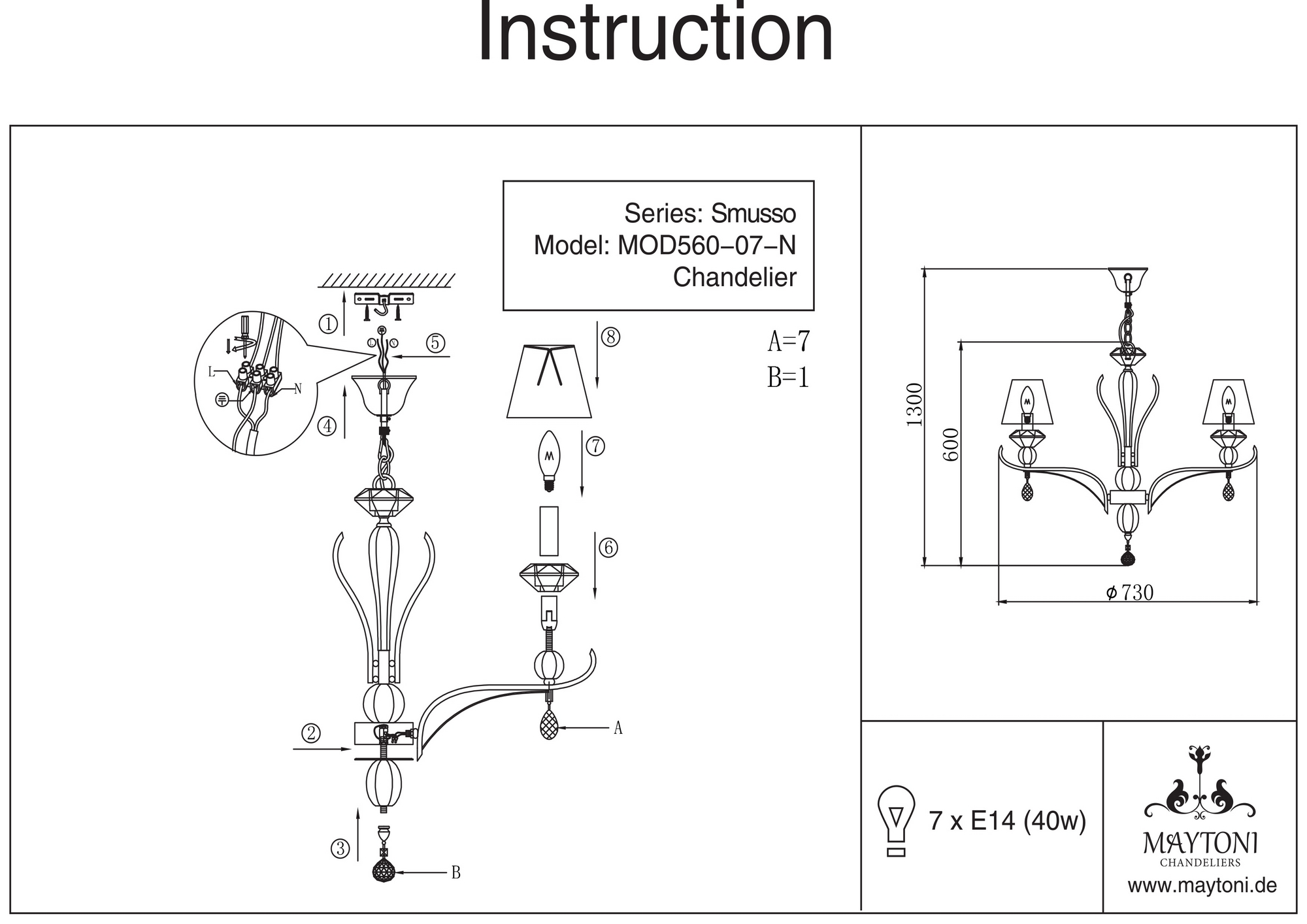 Люстра подвесная MOD560-07-N из серии Smusso от компании Maytoni устанавливается на металлический крюк. Классическая люстра прекрасно подойдет в качестве источника основного света для гостиной, холла, спальни, оформленных в стиле арт-деко. Основной цвет модели - белый, материал арматуры - металл. Люстра имеет 7 абажуров, материал изготовления - ткань. Модель оснащена цоколем E14 (7xE14), имеет 7 лампочек с общей мощностью 280W и напряжением 220V. Светильник поддерживает подключение диммера. Габариты: высота - 1110 мм, диаметр - 730 мм, длина подвеса - 400 мм. Лампочки в комплект не входят. Лучшая цена и условия доставки на Maytoni MOD560-07-N в интернет-магазине Fedomo.ru.