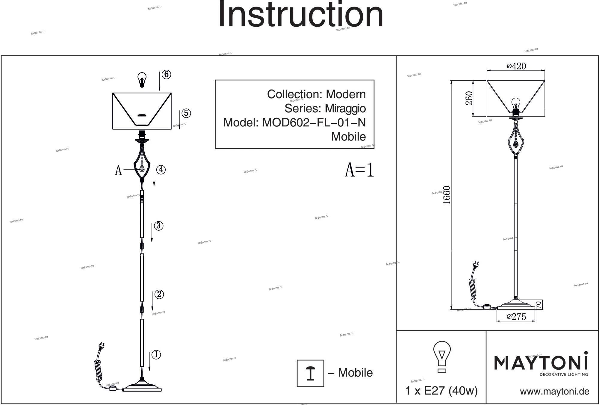 Торшер MOD602-FL-01-N из серии Miraggio от компании Maytoni будет удачно смотреться на полу в гостиной, спальне, оформленных в стиле арт-деко. Торшер имеет 1 абажур и 1 лампочку с цоколем E27, мощностью 40W и напряжением 220V. Модель устанавливается на основание, есть возможность подключения диммера. Основной материал и цвет арматуры - белый металл, материал абажура - ткань. Габариты изделия: высота - 1660 мм. Лампочки в комплект не входят. Лучшая цена и условия доставки на Maytoni MOD602-FL-01-N в интернет-магазине Fedomo.ru.