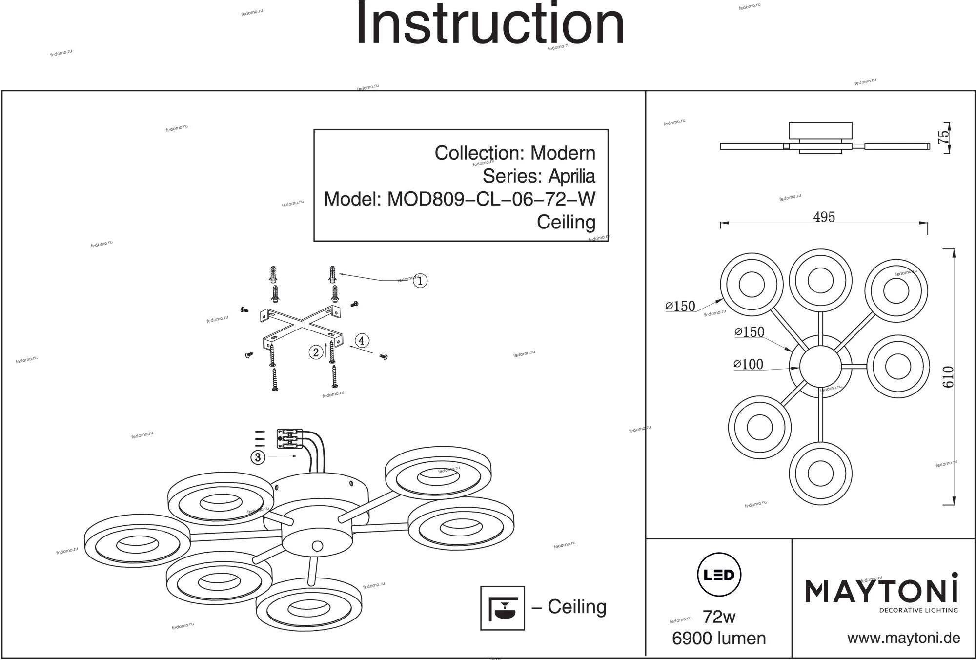 Люстра потолочная MOD809-CL-06-72-W из серии Aprilia от компании Maytoni устанавливается на монтажную пластину. Современная люстра прекрасно подойдет в качестве источника основного света для гостиной, спальни, кухни, оформленных в стиле хай-тек, минимализм. Основной цвет модели - белый, материал арматуры - металл. Люстра имеет 6 плафонов со свечением вниз, материал изготовления - матовый металл. Светодиодная модель с цоколем LED (6900xLED), имеет 6 лампочек с общей мощностью 432W и напряжением 220V. Габариты: ширина - 610 мм, высота - 30 мм. В комплекте есть лампочки. Лучшая цена и условия доставки на Maytoni MOD809-CL-06-72-W в интернет-магазине Fedomo.ru.