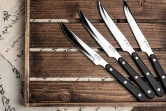 Ножи столовые для сервировки блюд из жареного и копченого мяса называются Стейковыми. Они созданы для резки готовых стейков, шашлыков, антрекотов, балыков, сала. Поставляются как поштучно, так и в наборах из нескольких одинаковых предметов для персональной сервировки. Стейковые японские ножи обычно изготовлены из нержавеющей стали, с прямыми заостренными кверху лезвиями длиной 11-15 см, имеют двустороннюю заточку с прямой или серрейторной кромкой. Закругление лезвия и острие позволяют с удобством резать мясо на тарелке, а удлиненная пята придерживать пальцами обух. Не требуют специальной подставки под ножи и определенно пригодятся на домашней, общественной кухне, а возможно, и на даче или пикнике. Набор Ножей Hatamoto для Стейков отличное решение, если вы любите стейки! Данные ножи не требовательны к уходу, благодаря чему нарезку можно производить не только на деревянной доске, но и на тарелке или металлической поверхности – стейковые ножи совершенно не пострадают от таких действий. Серрейторная заточка позволяет легко нарезать даже хорошо прожаренный стейк. При этом можно совершенно не опасаться, что они быстро затупятся, как обычные ножи при частой резке мяса. Ножи Hatamoto T-REX держат заточку до 10 лет! Ножи удобно использовать в качестве столовых. Модели нетребовательны к уходу и просты в обслуживании, рекомендуются для широкого круга любителей готовки на дому. Непревзойдённое сочетание удобства, качества, цены и технологии изготовления клинка делает эти ножи уникальными по своим потребительским характеристикам.
