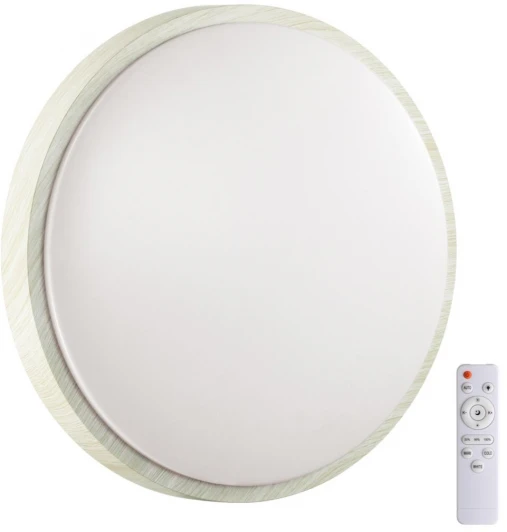 Светильник 7628/DL линии LOSTA состоит из металлического основания (базы) и пластикового рассеивателя. Материал рассеивателя - высококачественный пластик марки PMMA 2.0 белого цвета с матовой поверхностью, обеспечивающий светильнику равномерное рассеивание и хорошее светопропускание. Форма плафона: круглая, декорирована ободом из пластика под беленое дерево. Степень защиты IP43 позволяет использовать светильник в определенных зонах влажных помещений. В комплект входит заменяемый LED модуль с линзами, мощностью 48Вт, которая соответствует лампе накаливания 430Вт. А также пульт ДУ, с помощью которого осуществляется плавное изменение цветовой температуры 3000-4200-6300К, изменение яркости, переход в режим переключения теплого/белого/холодного/ночного света. Светильник имеет функцию "память".