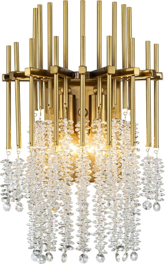 Светильники серии CAPPELLA — это воплощение природной мощи и красоты. Они напоминают сильный ливень, где каждая капля — это отдельный хрусталик, соединенный с другими в единую композицию. Каждый светильник серии CAPPELLA уникален и неповторим. Он способен преобразить любое пространство, добавив в него нотку природы и силы. Это идеальный выбор для тех, кто ценит естественную красоту и хочет создать в своем доме атмосферу гармонии и величия. Размер 250*85*390 Мощность E14 2?40W Цвет ЗОЛОТО/ПРОЗРАЧНЫЙ Материал МЕТАЛЛ/ХРУСТАЛЬ