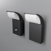 Материал корпуса - алюминий, цвет - графит. Белый матовый рассеиватель. LED-источник света. Цветовая температура 3000К. Наличие встроенного датчика движения у настенной модели. Степень защииты IP65 и IP44 настенной модели с датчиком движения.
