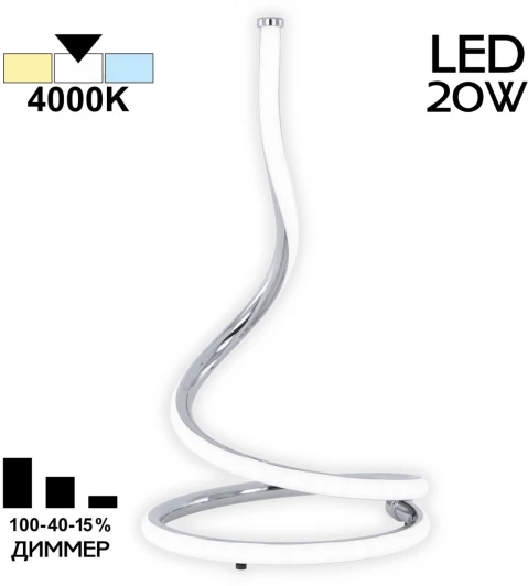 Настольный светодиодный светильник Citilux Джемини CL229811 выполнен в современном стиле. Корпус металлический, в форме изящно изогнутой спирали, цвет хром. Рассеиватель из оптического полимера. Изделие оснащено диммером с плавной регулировкой и памятью уровня яркости. Миниатюрный блок управления находится на проводе, в 20см от основания, длина провода 2м. Высота светильника 28см, диаметр 15,5см, мощность 20Вт, световая температура 4000К – нейтральный белый свет, безопасный для глаз, без мерцания и пульсаций.