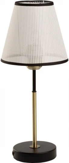 Основание настольной лампы выполнено из металла и окрашено в черный цвет, отдельные элементы гальванизированы в цвет античной бронзы. Традиционный источник света закрыт белым тканевым абажуром с линейным рисунком и имеет внутри термостойкий акрил. Края абажура отделаны черным кантом и прошиты.