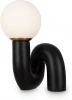 Изогнутое основание светильника выполнено из полирезина, цвет — черный. Плафон-сфера из белого матового стекла создает мягкий заливающий свет. Дизайн светильника воплощает в себе предмет искусства. Источник света — лампа с цоколем E14.