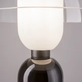 Металлическая арматура, цвет - черный. Светильники стилизованы под форму песочных часов с обтекаемой формой. Керамические элементы с глянцевой глазурью. Подвесные светильники с плафонами из белой керамики с прозрачным,