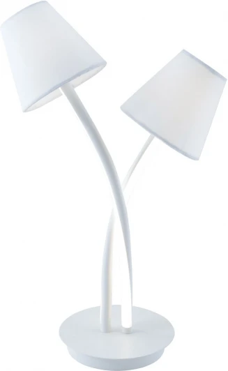 Металлическое основание настольной лампы окрашено в белый цвет. Корпус плафонов изогнутой формы выполнен из сплава алюминия с цинком и окрашен в цвет основания. Двухслойные абажуры состоят из текстиля белого цвета и термостойкого акрила с внутренней стороны. Абажуры прошиты. Светодиодные источники света закрыты белым силиконом.