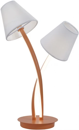 Металлическое основание настольной лампы окрашено в терракотовый цвет. Корпус плафонов изогнутой формы выполнен из сплава алюминия с цинком и окрашен в цвет основания. Двухслойные абажуры состоят из текстиля белого цвета и термостойкого акрила с внутренней стороны. Абажуры прошиты. Светодиодные источники света закрыты белым силиконом.