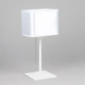 Основание металлическое, белого цвета. Абажур квадратной формы, изготовлены из белой атласной ткани на подложке из оптического полимера. В изделии используется лампа с цоколем Е27, максимальной мощностью для ламп накаливания 75Вт. Светодиодные лампы можно применять более яркие