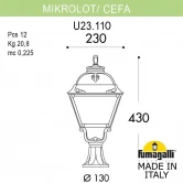 Светильники- столбики газонные FUMAGALLI серии CEFA, модель CEFA/MIKROLOT. Столбик малый MIKROLOT с уличным фонарем CEFA. Используются для архитектурного и ландшафтного освещения в стиле "классика". Место установки уличных светильников - перила лестниц, столбы заборов, колонны, тумбы, подпорные стенки, стилобаты, ландшафтные композиции в парках и скверах. В общем, там, где светильник находится на каком-то возвышении, тумбе или подиуме. Изготовлены в Италии, по уникальным технологиям "FUMAGALLI" из современного композитного полимера RESIN. Этот материал в 5 раз прочнее металла, не ржавеет, не окисляется, не выгорает на солнце, его не нужно красить. Все светильники пыле-влаго защищены по стандарту IP55 (Пылезащищенные, защита от водяных струй с любого направления). В комплекте идут крепежи и закладные элементы. Рассеиватель выполнен из антивандального, не мутнеющего и не горючего PMMA (ПолиМетилМетаАкрилат). Срок службы светильника - не менее 20 лет. Температура использования от +60 до -90. В серии GLOBE 300 есть фонари в настенном (BISSO/CEFA, OFIR/CEFA, MIRRA/CEFA, PORPORA/CEFA) подвесном (SICHEM/CEFA) и наземном исполнении (MINILOT/CEFA, MIZAR.R/CEFA, IAFAET.R/CEFA, ALOE.R/CEFA, ARTU/CEFA, GIGI/CEFA, RICU/CEFA, RICU/ISSO/CEFA 2L, NEBO/CEFA, NEBO OFIR/CEFA 2L, NEBO OFIR/CEFA 3L) со столбами разной высоты, с разным количеством и конфигурацией голов. Консоли настенных фонарей и кронштейны светильников на столбах освщения могут устанавливаться вверх/вниз. Столбы выше 150 см имеют в основе мощную стальную трубу с двойной оцинковкой. При заказе требуется выбрать цвет корпуса, цвет плафона и тип патрона. По стилю и дизайну серия уличных светильников CEFA похожа на светильники большого размера SIMON и на светильники очень большого размера (Гранд) PIETRO. По размеру CEFA относится к средним светильникам как серия RUT, SALEM и GLOBE 300.