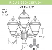 Садовые светильники - столбы FUMAGALLI серии GLOBE CEFA, модель CEFA /RICU/BISSO 3+1. Парковый торшер, столб RICU с тремя уличными фонарями CEFA на трех малых консолях BISSO и одним светильником на опоре. Используются для архитектурного и ландшафтного освещения в стиле "классика". Место установки столбиков освещения - парковые дорожки, cкверы, садовые участки, тротуары, а так же ландшафтные и архитектурные объекты. Могут устанавливаться и внутри помещений в качестве декоративных уличных фонарей. Изготовлены в Италии, по уникальным технологиям "FUMAGALLI" из современного композитного полимера RESIN. Этот материал в 5 раз прочнее металла, не ржавеет, не окисляется, не выгорает на солнце, его не нужно красить. Все светильники пыле-влаго защищены по стандарту IP55 (Пылезащищенные, защита от водяных струй с любого направления). В комплекте идут крепежи и закладные элементы. Рассеиватель выполнен из антивандального, не мутнеющего и не горючего PMMA (ПолиМетилМетаАкрилат). Срок службы светильника - не менее 20 лет. Температура использования от +60 до -90. В серии GLOBE 300 есть фонари в настенном (BISSO/CEFA, OFIR/CEFA, MIRRA/CEFA, PORPORA/CEFA) подвесном (SICHEM/CEFA) и наземном исполнении (MINILOT/CEFA, MIZAR.R/CEFA, IAFAET.R/CEFA, ALOE.R/CEFA, ARTU/CEFA, GIGI/CEFA, RICU/CEFA, RICU/ISSO/CEFA 2L, NEBO/CEFA, NEBO OFIR/CEFA 2L, NEBO OFIR/CEFA 3L) со столбами разной высоты, с разным количеством и конфигурацией голов. Консоли настенных фонарей и кронштейны светильников на столбах освщения могут устанавливаться вверх/вниз. Столбы выше 150 см имеют в основе мощную стальную трубу с двойной оцинковкой. При заказе требуется выбрать цвет корпуса, цвет плафона и тип патрона. По стилю и дизайну серия уличных светильников CEFA похожа на светильники большого размера SIMON и на светильники очень большого размера (Гранд) PIETRO. По размеру CEFA относится к средним светильникам как серия RUT, SALEM и GLOBE 300.