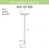 Садово-парковый фонарь FUMAGALLI серии GLOBE 250, модель GLOBE 250/RICU/BISSO 2L. Парковый торшер, столб RICU с двумя уличными фонарями GLOBE 250 на малых консолях BISSO. Используются для архитектурного и ландшафтного освещения в стиле "классика". Место установки столбиков освещения - парковые дорожки, cкверы, садовые участки, тротуары, а так же ландшафтные и архитектурные объекты. Изготовлены в Италии, по уникальным технологиям "FUMAGALLI" из современного композитного полимера RESIN. Этот материал в 5 раз прочнее металла, не ржавеет, не окисляется, не выгорает на солнце, его не нужно красить. Все светильники пыле-влаго защищены по стандарту IP55 (Пыленепроницаемые, защита от водяных струй с любого направления). В комплекте идут крепежи и закладные элементы. Рассеиватель выполнен из антивандального, не мутнеющего и не горючего PMMA (ПолиМетилМетаАкрилат). Срок службы светильника - не менее 20 лет. Температура использования от -60 до +90. В серии GLOBE 250 есть фонари в настенном (BISSO/GLOBE 250, OFIR/GLOBE 250, MIRRA/GLOBE 250, PORPORA/GLOBE 250) подвесном (SICHEM/GLOBE 250) и наземном исполнении (IAFAET.R/GLOBE 250, ALOE.R/GLOBE 250, ARTU/GLOBE 250, GIGI/GLOBE 250, RICU/GLOBE 250, RICU/ISSO/GLOBE 250 1L, RICU/ISSO/GLOBE 250 2L, RICU/ISSO/GLOBE 250 3L) со столбами разной высоты, с разным количеством и конфигурацией голов. Консоли настенных фонарей и кронштейны светильников на столбах освщения могут устанавливаться вверх/вниз. Столбы выше 150 см имеют в основе мощную стальную трубу с двойной оцинковкой. При заказе требуется выбрать цвет корпуса, цвет плафона и тип патрона. По стилю и дизайну серия уличных светильников GLOBE 250 похожа на светильники большого размера GLOBE 400 и на светильники среднего размера GLOBE 300. Тип крепления: Анкерная закладная ТИП "B" (3 закладных детали, рамка, гайки, декоративные колпачки). Комплектация: С уличной лампой "FUMAGALLI" яркостью 800Lm. Спец. для улицы, с защитой от скачков напряжения, перепадов температуры и повышенной влажности.