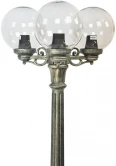 Садово-парковый фонарь FUMAGALLI серии GLOBE 250, модель GLOBE 250/RICU/BISSO 3L. Парковый торшер, столб RICU с тремя уличными фонарями GLOBE 250 на малых консолях BISSO. Используются для архитектурного и ландшафтного освещения в стиле "классика". Место установки столбиков освещения - парковые дорожки, cкверы, садовые участки, тротуары, а так же ландшафтные и архитектурные объекты. Изготовлены в Италии, по уникальным технологиям "FUMAGALLI" из современного композитного полимера RESIN. Этот материал в 5 раз прочнее металла, не ржавеет, не окисляется, не выгорает на солнце, его не нужно красить. Все светильники пыле-влаго защищены по стандарту IP55 (Пыленепроницаемые, защита от водяных струй с любого направления). В комплекте идут крепежи и закладные элементы. Рассеиватель выполнен из антивандального, не мутнеющего и не горючего PMMA (ПолиМетилМетаАкрилат). Срок службы светильника - не менее 20 лет. Температура использования от -60 до +90. В серии GLOBE 250 есть фонари в настенном (BISSO/GLOBE 250, OFIR/GLOBE 250, MIRRA/GLOBE 250, PORPORA/GLOBE 250) подвесном (SICHEM/GLOBE 250) и наземном исполнении (IAFAET.R/GLOBE 250, ALOE.R/GLOBE 250, ARTU/GLOBE 250, GIGI/GLOBE 250, RICU/GLOBE 250, RICU/ISSO/GLOBE 250 1L, RICU/ISSO/GLOBE 250 2L, RICU/ISSO/GLOBE 250 3L) со столбами разной высоты, с разным количеством и конфигурацией голов. Консоли настенных фонарей и кронштейны светильников на столбах освщения могут устанавливаться вверх/вниз. Столбы выше 150 см имеют в основе мощную стальную трубу с двойной оцинковкой. При заказе требуется выбрать цвет корпуса, цвет плафона и тип патрона. По стилю и дизайну серия уличных светильников GLOBE 250 похожа на светильники большого размера GLOBE 400 и на светильники среднего размера GLOBE 300. Тип крепления: Анкерная закладная ТИП "B" (3 закладных детали, рамка, гайки, декоративные колпачки). Комплектация: С уличной лампой "FUMAGALLI" яркостью 800Lm. Спец. для улицы, с защитой от скачков напряжения, перепадов температуры и повышенной влажности.