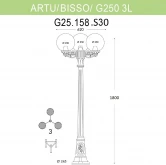 Садово-парковый фонарь FUMAGALLI серии GLOBE 250, модель GLOBE 250/ARTU/BISSO 3L. Парковый торшер, столб ARTU с тремя уличными фонарями GLOBE 250 на малых консоля BISSO. Используются для архитектурного и ландшафтного освещения в стиле "классика". Место установки столбиков освещения - парковые дорожки, cкверы, садовые участки, тротуары, а так же ландшафтные и архитектурные объекты. Изготовлены в Италии, по уникальным технологиям "FUMAGALLI" из современного композитного полимера RESIN. Этот материал в 5 раз прочнее металла, не ржавеет, не окисляется, не выгорает на солнце, его не нужно красить. Все светильники пыле-влаго защищены по стандарту IP55 (Пыленепроницаемые, защита от водяных струй с любого направления). В комплекте идут крепежи и закладные элементы. Рассеиватель выполнен из антивандального, не мутнеющего и не горючего PMMA (ПолиМетилМетаАкрилат). Срок службы светильника - не менее 20 лет. Температура использования от -60 до +90. В серии GLOBE 250 есть фонари в настенном (BISSO/GLOBE 250, OFIR/GLOBE 250, MIRRA/GLOBE 250, PORPORA/GLOBE 250) подвесном (SICHEM/GLOBE 250) и наземном исполнении (IAFAET.R/GLOBE 250, ALOE.R/GLOBE 250, ARTU/GLOBE 250, GIGI/GLOBE 250, RICU/GLOBE 250, RICU/ISSO/GLOBE 250 1L, RICU/ISSO/GLOBE 250 2L, RICU/ISSO/GLOBE 250 3L) со столбами разной высоты, с разным количеством и конфигурацией голов. Консоли настенных фонарей и кронштейны светильников на столбах освщения могут устанавливаться вверх/вниз. Столбы выше 150 см имеют в основе мощную стальную трубу с двойной оцинковкой. При заказе требуется выбрать цвет корпуса, цвет плафона и тип патрона. По стилю и дизайну серия уличных светильников GLOBE 250 похожа на светильники большого размера GLOBE 400 и на светильники среднего размера GLOBE 300. Тип крепления: Анкерная закладная ТИП "B" (3 закладных детали, рамка, гайки, декоративные колпачки). Комплектация: С уличной лампой "FUMAGALLI" яркостью 800Lm. Спец. для улицы, с защитой от скачков напряжения, перепадов температуры и повышенной влажности.