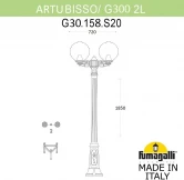 Садово-парковый фонарь FUMAGALLI серии GLOBE 300, модель ARTU/BISSO/GLOBE 300 2L. Парковый торшер, столб ARTU с двумя уличными фонарями GLOBE 300 на консолях BISSO малого размера. Используются для архитектурного и ландшафтного освещения в стиле "классика". Место установки столбиков освещения - парковые дорожки, тротуары, газоны в парках и скверах, а так же ландшафтные и архитектурные объекты. Изготовлены в Италии, по уникальным технологиям "FUMAGALLI" из современного композитного полимера RESIN. Этот материал в 5 раз прочнее металла, не ржавеет, не окисляется, не выгорает на солнце, его не нужно красить. Все светильники пыле-влаго защищены по стандарту IP65 (Пыленепроницаемые, защита от водяных струй с любого направления). В комплекте идут крепежи и закладные элементы. Рассеиватель выполнен из антивандального, не мутнеющего и не горючего PMMA (ПолиМетилМетаАкрилат). Срок службы светильника - не менее 20 лет. Температура использования от -60 до +90. В серии GLOBE 300 есть фонари в настенном (BISSO/GLOBE 300, OFIR/GLOBE 300, MIRRA/GLOBE 300, PORPORA/GLOBE 300) подвесном (SICHEM/GLOBE 300) и наземном исполнении (IAFAET.R/GLOBE 300, MIZAR.R/GLOBE 300, ARTU/GLOBE 300, MIZAR.R/GLOBE 300, GIGI/GLOBE 300, RICU/ISSO/GLOBE 3002L, NEBO/GLOBE 300, NEBO OFIR/GLOBE 300 2L, NEBO OFIR/GLOBE 300 3L, TABOR ADAM/GLOBE 300 1L, TABOR ADAM/GLOBE 300 2L, TABOR OFIR/GLOBE 300 3L) со столбами разной высоты, с разным количеством и конфигурацией голов. Консоли настенных фонарей и кронштейны светильников на столбах освщения могут устанавливаться вверх/вниз. Столбы выше 150 см имеют в основе мощную стальную трубу с двойной оцинковкой. При заказе требуется выбрать цвет корпуса, цвет плафона и тип патрона. По стилю и дизайну серия уличных светильников GLOBE 300 похожа на светильники большого размера GLOBE 400 и на светильники малого размера GLOBE 250. Тип крепления: Анкерная закладная ТИП "B" (3 закладных детали, рамка, гайки, декоративные колпачки). В комплекте филаментовые светодиодные лампочки "FUMAGALLI" яркостью 800 L. m