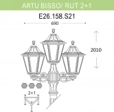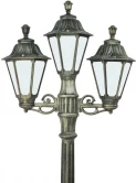 Садовые светильники - столбы FUMAGALLI серии GLOBE RUT, модельRUT /ARTU/BISSO 2+1. Парковый торшер, столб ARTU с двумя уличными фонарями RUT на двух малых консолях BISSO и одним светильником на опоре. По форме напоминае "трезубец". Используются для архитектурного и ландшафтного освещения в стиле "классика". Место установки столбиков освещения - парковые дорожки, cкверы, садовые участки, тротуары, а так же ландшафтные и архитектурные объекты. Могут устанавливаться и внутри помещений в качестве декоративных уличных фонарей. Изготовлены в Италии, по уникальным технологиям "FUMAGALLI" из современного композитного полимера RESIN. Этот материал в 5 раз прочнее металла, не ржавеет, не окисляется, не выгорает на солнце, его не нужно красить. Все светильники пыле-влаго защищены по стандарту IP55 (Пылезащищенные, защита от водяных струй с любого направления). Рассеиватель выполнен из антивандального, не мутнеющего и не горючего PMMA (ПолиМетилМетаАкрилат). Срок службы светильника - не менее 20 лет. Температура использования от +60 до -90. В серии GLOBE 300 есть фонари в настенном (BISSO/ RUT, OFIR/ RUT, MIRRA/ RUT, PORPORA/ RUT) подвесном (SICHEM/ RUT) и наземном исполнении (MINILOT/ RUT, MIZAR.R/ RUT, IAFAET.R/ RUT, ALOE.R/ RUT, ARTU/ RUT, GIGI/ RUT, RICU/ RUT, RICU/ISSO/ RUT 2L, NEBO/ RUT, NEBO OFIR/ RUT 2L, NEBO OFIR/ RUT 3L) со столбами разной высоты, с разным количеством и конфигурацией голов. Консоли настенных фонарей и кронштейны светильников на столбах освщения могут устанавливаться вверх/вниз. Столбы выше 150 см имеют в основе мощную стальную трубу с двойной оцинковкой. При заказе требуется выбрать цвет корпуса, цвет плафона и тип патрона. По стилю и дизайну серия уличных светильников RUT похожа на светильники малого размера серии ANNA и на светильники большого размера серии NOEMI.
