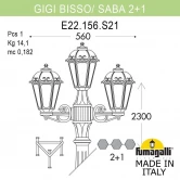 Садовые светильники - столбы FUMAGALLI серии SABA, модель SABA /GIGI/BISSO 2+1. Парковый торшер, столб GIGI с двумя уличными фонарями SABA на двух малых консолях BISSO и одним светильником на опоре. По форме напоминает "трезубец". Используются для архитектурного и ландшафтного освещения в стиле "классика". Место установки столбиков освещения - парковые дорожки, cкверы, садовые участки, тротуары, а так же ландшафтные и архитектурные объекты. Могут устанавливаться и внутри помещений в качестве декоративных уличных фонарей. Изготовлены в Италии, по уникальным технологиям "FUMAGALLI" из современного композитного полимера RESIN. Этот материал в 5 раз прочнее металла, не ржавеет, не окисляется, не выгорает на солнце, его не нужно красить. Все светильники пыле-влаго защищены по стандарту IP44 (защита от попадания твердых частиц более 1мм., защита от капель или брызг, падающих под любым углом). Рассеиватель выполнен из антивандального, не мутнеющего и не горючего PMMA (ПолиМетилМетаАкрилат). Срок службы светильника - не менее 20 лет. Температура использования от +60 до -90. В серии SABA есть фонари в настенном (BISSO/SABA, PORPORA/SABA) подвесном (SICHEM/SABA, SICHEM/SABA 3L) и наземном исполнении (IAFAET.R/SABA, ALOE.R/SABA, ARTU/SABA, GIGI/SABA, RICU/SABA, RICU/ISSO/SABA 1L, RICU/ISSO/SABA 2L, RICU/ISSO/SABA 3L) со столбами разной высоты, с разным количеством и конфигурацией голов. Консоли настенных фонарей и кронштейны светильников на столбах освещения могут устанавливаться вверх/вниз. Столбы выше 150 см имеют в основе мощную стальную трубу с двойной оцинковкой. При заказе требуется выбрать цвет корпуса, цвет плафона и тип патрона. Возможен светодиодный вариант с цоколем GX-53. По стилю и дизайну серия уличных светильников SABA похожа на светильники среднего размера серии SALEM и на светильники большого размера серии SILOE. По размеру SABA относится к малым светильникам как серия ANNA и GLOBE 250.