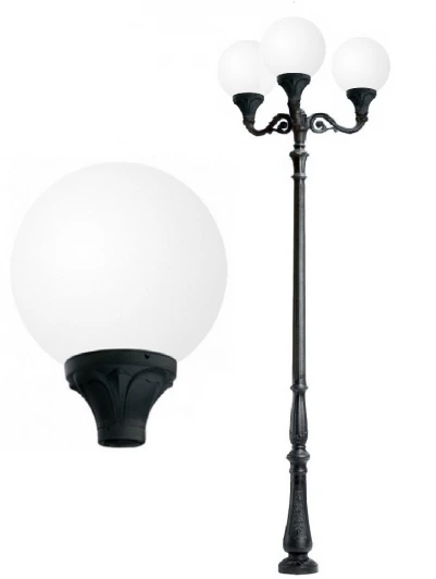Парковый фонарь FUMAGALLI большого размера серии GLOBE 400, модель TABOR ADAM/GLOBE 400 3L. Парковый фонарь с 3 светильниками - шарами большого размера, на консолях ADAM большого размера, установленных на классическом столбе TABOR высотой 3,0 м (+высота фонарей на кронштейнах). Изготовлен в Италии, по уникальным технологиям "FUMATECH" из современного композитного полимера RESIN. Этот материал в 5 раз прочнее силумина, не ржавеет, не окисляется, не выгорает на солнце, его не нужно красить. Все светильники пыле-влаго защищены по стандарту IP65 (Пыленепроницаемые, защита от водяных струй с любого направления). Рассеиватель выполнен из антивандального, не мутнеющего и не горючего PMMA (ПолиМетилМетаАкрилат). Срок службы светильника - не менее 20 лет. Температура использования от -60 до +90. В серии GLOBE 400 есть ландшафтные фонари в настенном (ADAM/GLOBE 400, ADAM/GLOBE 400) и наземном исполнении (TABOR/GLOBE 400, HOREB/GLOBE 400) со столбами разной высоты, с разным количеством и конфигурацией голов. Консоли настенных фонарей и кронштейны светильников на столбах освещения устанавливаются в положение "вверх" и "вниз". Столбы имеют в основе мощную стальную трубу с двойной оцинковкой и монтажный люк. Закладные элементы- в комплекте. При заказе требуется выбрать цвет корпуса и цвет плафона.