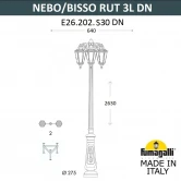 Парковый фонарь FUMAGALLI среднего размера серии RUT, модель NEBO BISSO/RUT 3L DN. Парковый фонарь с 3 светильниками, на консолях BISSO малого размера, установленных на классическом столбе NEBO высотой 2,5 м (+высота фонарей на кронштейнах). Монтаж консолей в положение"вниз". Изготовлены в Италии, по уникальным технологиям "FUMATECH" из современного композитного полимера RESIN. Этот материал в 5 раз прочнее металла, не ржавеет, не окисляется, не выгорает на солнце, его не нужно красить. Все светильники пыле-влаго защищены по стандарту IP55 (Пылезащищенные, защита от водяных струй с любого направления). Рассеиватель выполнен из антивандального, не мутнеющего и не горючего PMMA (ПолиМетилМетаАкрилат). Срок службы светильника - не менее 20 лет. Температура использования от -60 до +90. В серии RUT есть садовые фонари в настенном (OFIR/RUT, MIRRA/RUT) подвесном (SICHEM/RUT) и наземном исполнении (IAFAET.R/RUT, ALOE.R/RUT, ARTU/RUT, GIGI/RUT, RICU/RUT, NEBO/OFIR/RUT 1L, NEBO/OFIR/ANNA 2L, TABOR/ADAM/RUT 3L) со столбами разной высоты, с разным количеством и конфигурацией голов. Консоли настенных фонарей и кронштейны светильников на столбах освещения могут устанавливаться в положение вверх и вниз.Столбы выше 150 см имеют в основе мощную стальную трубу с двойной оцинковкой. При заказе требуется выбрать цвет корпуса, цвет плафона. По стилю и дизайну серия уличных светильников RUT похожа на светильники большого размера серии NOEMI и малого размера серии ANNA . По размеру относится к средним парковым светильникам как серия CEFA и GLOBE 300.